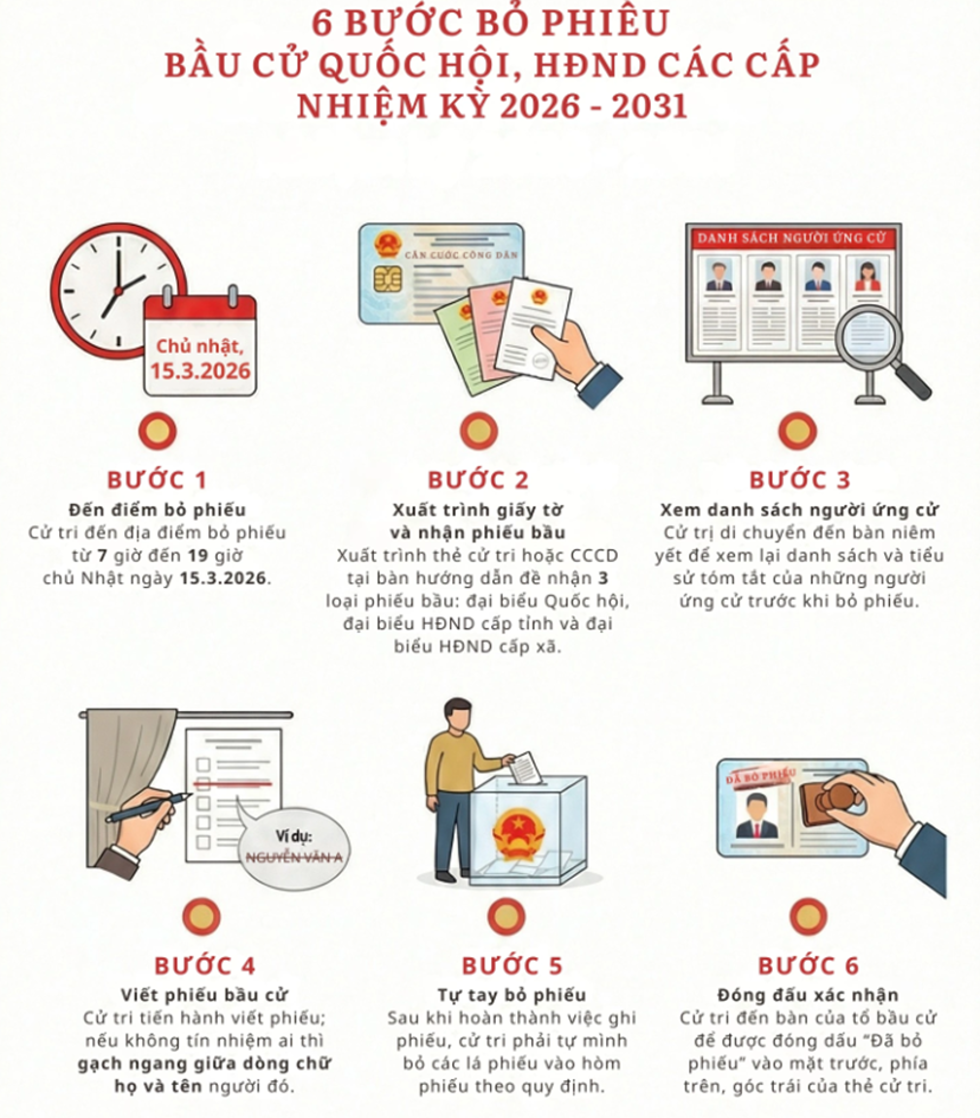 Ngày 15/3/2026, hãy đi bầu cử đúng giờ, mang theo Thẻ cử tri và thực hiện đầy đủ các bước bỏ phiếu để cùng góp phần lựa chọn những đại biểu xứng đáng đại diện cho Nhân dân.