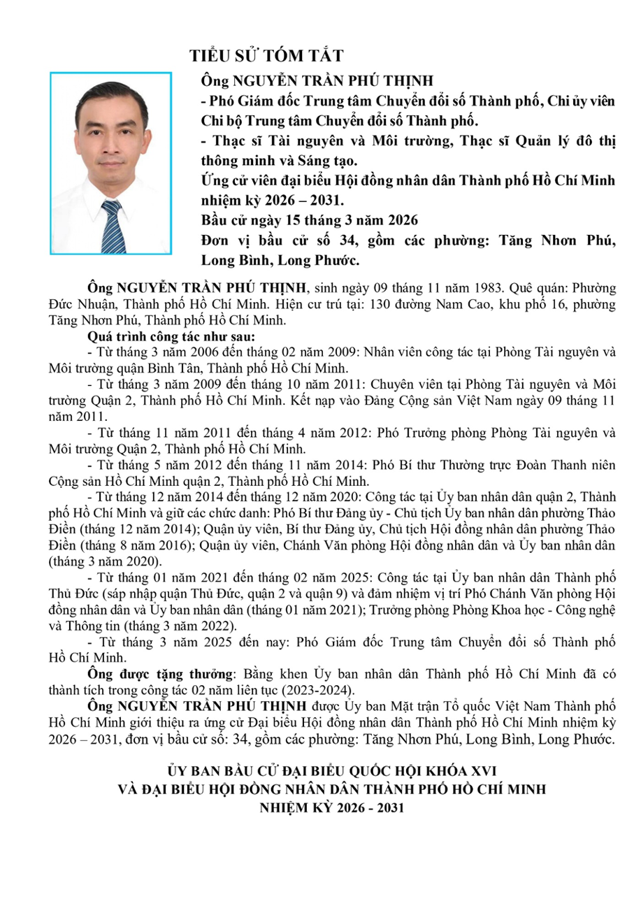 Trung tâm Chuyển đổi số Thành phố trân trọng giới thiệu đồng chí Nguyễn Trần Phú Thịnh – Phó Giám đốc Trung tâm tham gia ứng cử đại biểu Hội đồng nhân dân TP.HCM khóa XI, nhiệm kỳ 2026 – 2031 tại đơn vị bầu cử số 34, gồm các phường: Tăng Nhơn Phú, Long Bình, Long Phước.