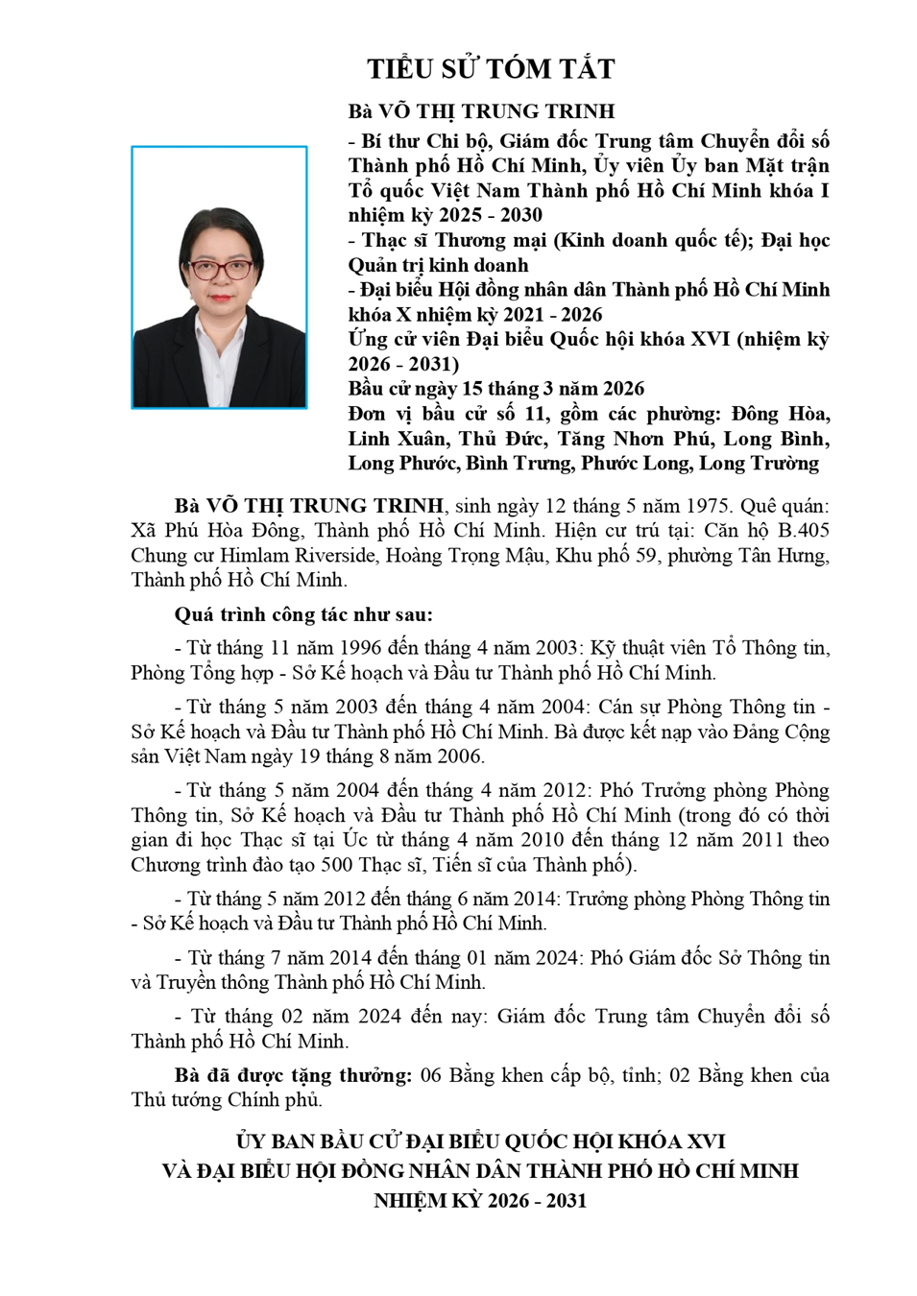 Trung tâm Chuyển đổi số Thành phố trân trọng giới thiệu đồng chí Võ Thị Trung Trinh – Giám đốc Trung tâm tham gia ứng cử đại biểu Quốc hội khóa XVI, nhiệm kỳ 2026 – 2031 tại đơn vị bầu cử số 11 TP.HCM gồm các phường: Đông Hòa, Linh Xuân, Thủ Đức, Tăng Nhơn Phú, Long Bình, Long Phước, Bình Trưng, Phước Long, Long Trường.