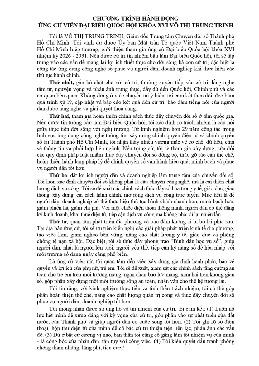 Với nhiều năm kinh nghiệm trong lĩnh vực chuyển đổi số và quản lý nhà nước, đồng chí Võ Thị Trung Trinh định hướng chương trình hành động tập trung thúc đẩy chính quyền số, kinh tế số, xã hội số, tăng cường ứng dụng công nghệ và dữ liệu để nâng cao hiệu quả quản trị, cải cách thủ tục hành chính và phục vụ người dân, doanh nghiệp tốt hơn.